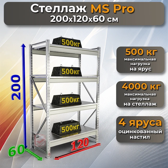 Стеллаж металлический для склада MS Pro 200х120х60 с 4 полками — надежное решение для организации хранения в складских и бытовых помещениях.