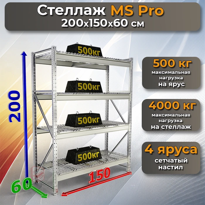 Стеллаж сетка металлическая MS Pro 200х150х60 4 полки